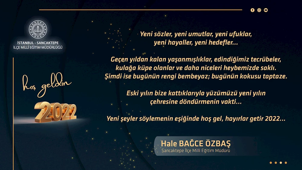 Sancaktepe İlçe Milli Eğitim Müdürü Hale Bağce Özbaş, yeni yılı kutlama mesajı yayınladı.