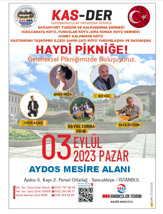 KAS-DER Sancaktepe Şubesi yönetim kurulu yaptığı duyuruda ' 3 Eylül 2023 Pazar günü Aydos Mesire alanında düzenlenecek olan pikniğe tüm Kastamonuluları ve dostlarımızı bekliyoruz' ifadelerine yer verdi.