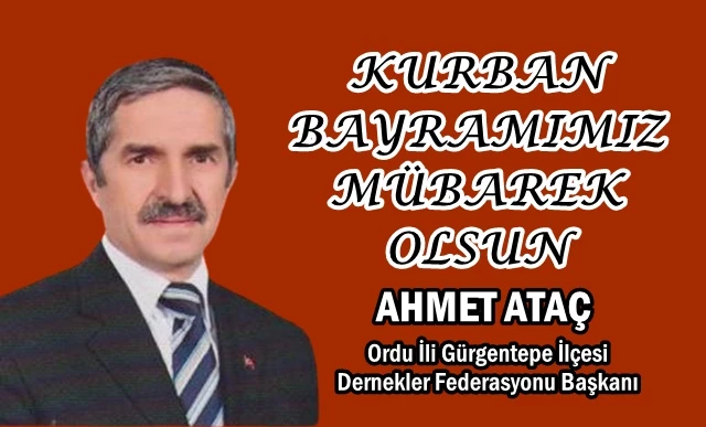 Sancaktepe İlçesi Derneklerinden olan, Ordu İli Gürgentepe İlçesi Dernekler Federasyonu Başkanı Ahmet Ataç, Kurban Bayramı münasebetiyle tebrik mesajı yayınladı. Ordu İli Gürgentepe İlçesi Dernekler Federasyonu Başkanı Ahmet Ataç mesajında şu ifadelere yer verdi ; ' Küskünlerin barıştığı, kırgınlıkların sona erdiği, hasretliklerin kavuştuğu bir bayramı daha milletçe idrak ediyoruz… Mübarek Kurban Bayramı'nın aziz milletimize, İslam Dünyası'na ve tüm insanlığa barış huzur ve mutluluk getirmesini Yüce Allah'tan niyaz ediyorum…'