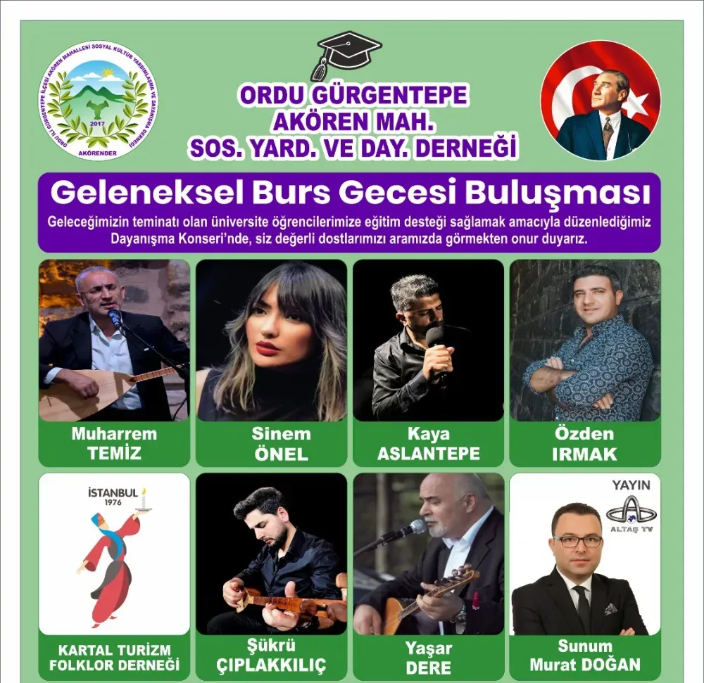 Ordu Gürgentepe Akören Mahallesi Sosyal Yardımlaşma ve Dayanışma Derneği (Gürgentepe Akörenliler Derneği), her yıl büyük bir ilgiyle beklenen geleneksel burs gecesi buluşmasını düzenliyor. Eğitime destek amacıyla gerçekleştirilecek bu özel gecede, sanat ve dayanışma aynı sahnede buluşacak.